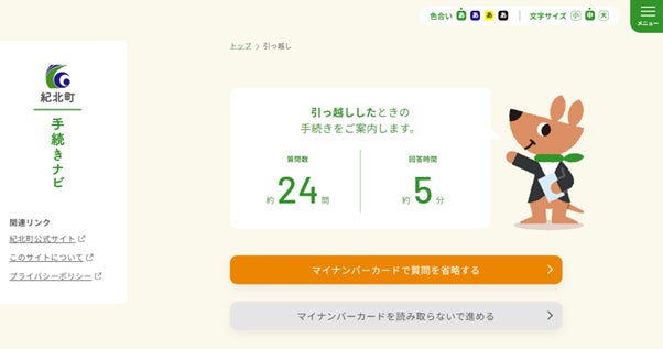 紀北町は、総務省が推進する令和5年度自治体フロントヤード改革モデルプロジェクトに採択されました。その支援事業を株式会社ガバメイツ(以下ガバメイツ)が受託し、アスコエパートナーズのナビゲーション形式で簡易な質問に答えていくことで必要な手続きを探すことができる『わたしの手続きコンシェルジュ:手続きナビ』の導入に至りました。