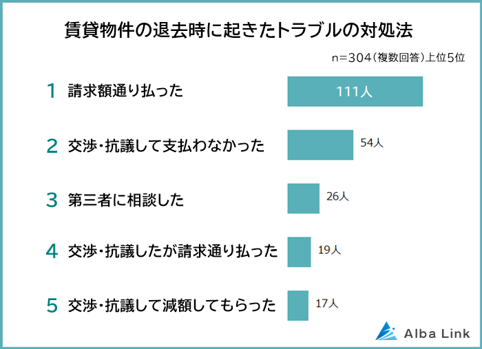 賃貸物件を退去する際に起きたトラブルに対してどのように対処したかを聞いたところ、圧倒的1位は「請求額通り払った(111人)」でした。3割以上の人は、不満をもちつつも請求通りに支払っていることがわかります。