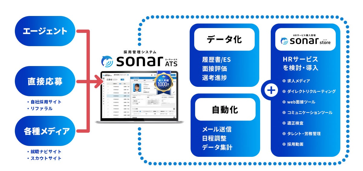 採用管理システム「sonar ATS」は、株式会社サイバーエージェント、Chatwork株式会社、トヨタ自動車株式会社など1,000社以上※に利用されている「採用の成功」のために開発された採用管理システムです。2022年にサービス提供開始から10周年を迎えました。※2022年1月時点