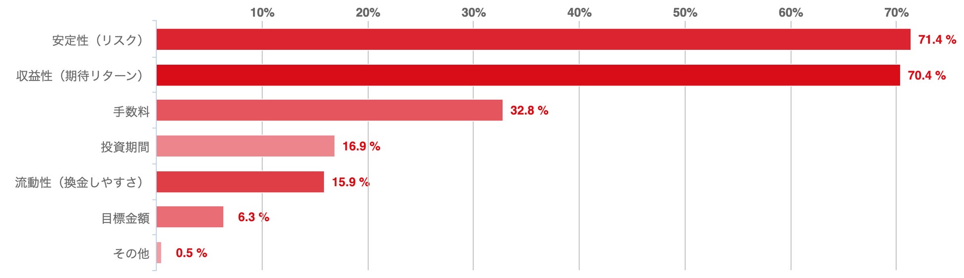 アンケートによれば、サラリーマンが運用先を選ぶ際に重視する要素としては、「リスク(71.4%)」と「期待リターン(70.4%)」が突出して多かった。