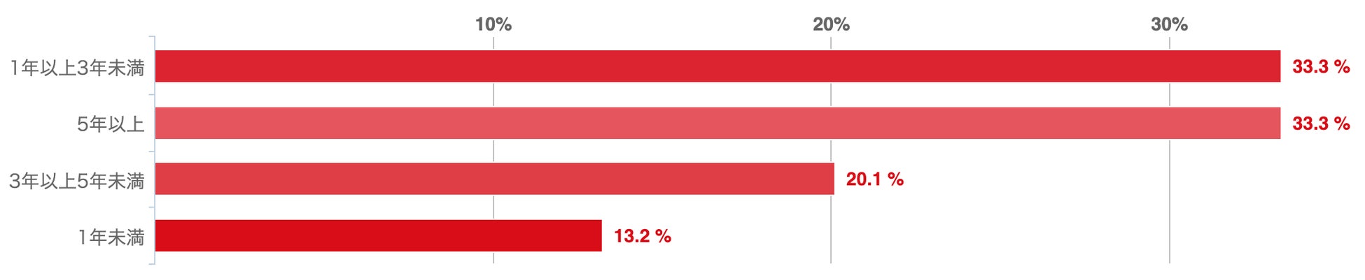 サラリーマンの運用経験は「1年以上3年未満」と「5年以上」がそれぞれ33.3%で最も多く、「1年未満」が13.2%で最も少なかった。この結果から、回答者の多くは1年以上の運用を続けているが、それぞれの投資経験は個人差が大きいことがわかった。