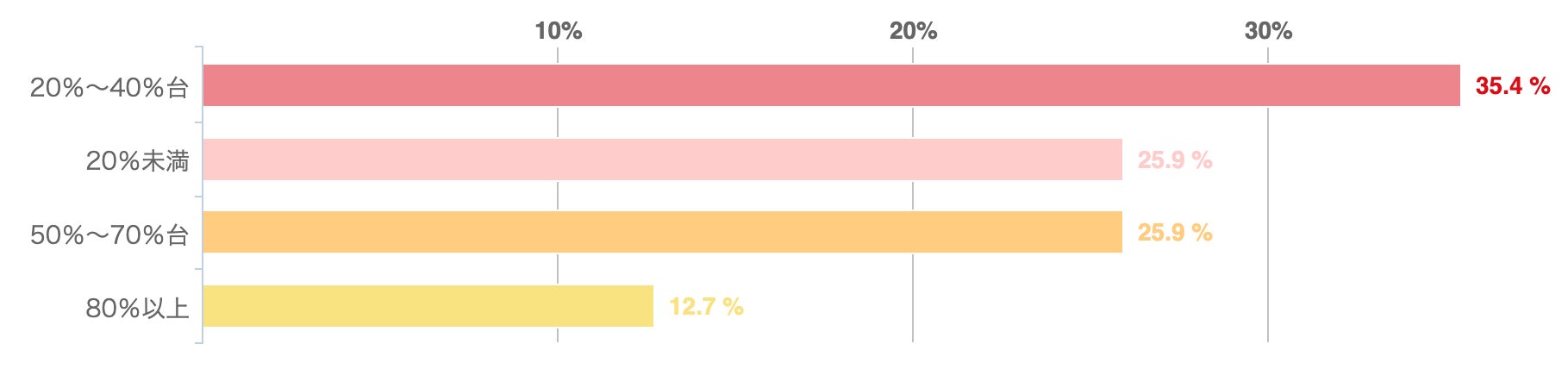 アンケートによれば、サラリーマンの保有資産に占める運用資産の割合は、「20%〜40%台」が35.4%で最も多く、「20%未満」と「50%〜70%台」が25.9%で並ぶ形となった。