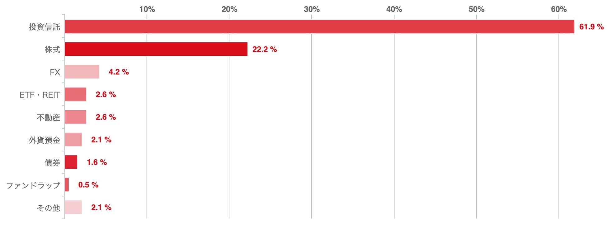 回答者の66.6%が投資信託を、61.6%が株式を何らかの形でポートフォリオに組み込んでおり、実に過半数を超える投資家がこれら2種類の資産クラスを活用していたことがわかった。