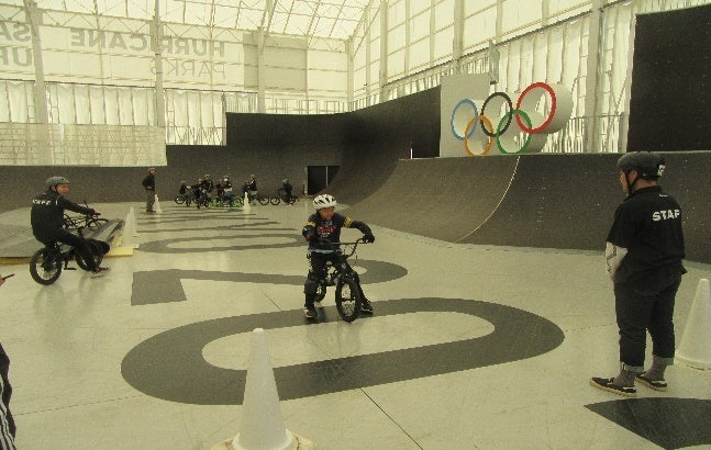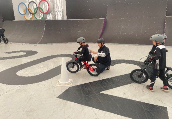 参加した児童からは、「すごく楽しかった」「BMXをまたやりたい」との声が多く、国際大会も開催できるオリンピックのエンブレムの掲げられた特別な空間で、楽しい体験教室となりました。