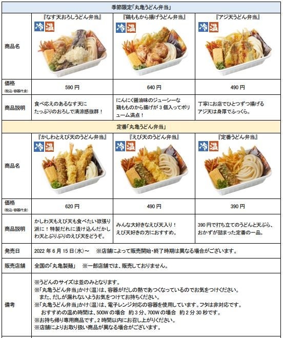 株式会社丸亀製麺(本社:東京都渋谷区、代表取締役社長:山口 寛)が展開する讃岐うどん専門店「丸亀製麺」は、「丸亀うどん弁当」販売開始から1周年を迎え、累計販売数2,200万食を突破いたしました。そんな大好評の「丸亀うどん弁当」から、ジメジメと暑くなるこれからの季節にぴったりな『なす天おろしうどん弁当』、『鶏ももから揚げうどん弁当』、『アジ天うどん弁当』を2022年6月15日(水)より期間限定で販売いたします。