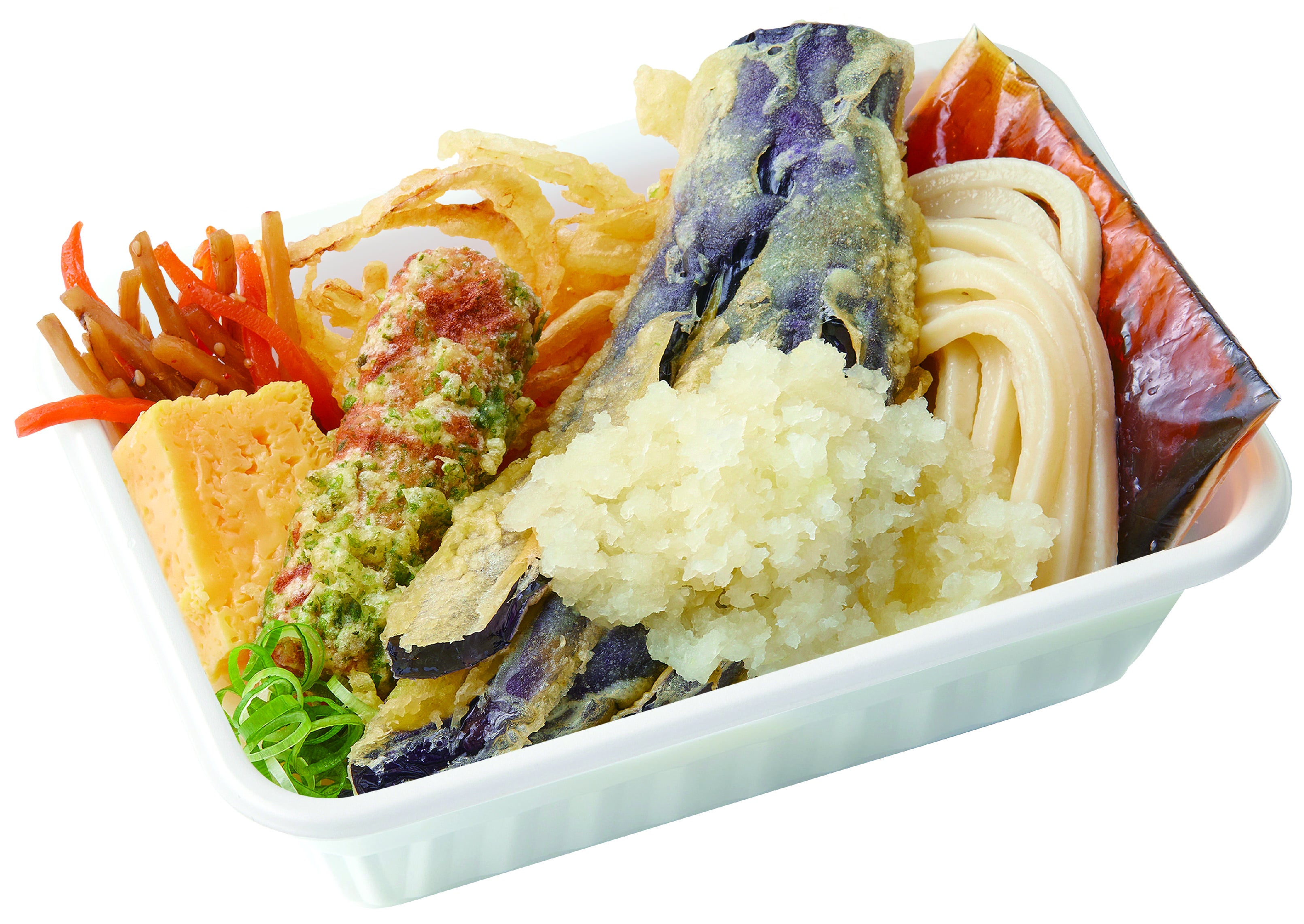 食べ応え十分な「なす天」とみずみずしい「大根おろし」がのった『なす天おろしうどん弁当』は、これから来るジメジメとした夏の日にもさっぱりとお召し上がりいただけます。天ぷらにすることで、中はふわふわとジューシーな「なす天」は、だしに浸すと、ほのかな甘みがより引き立ちます。みずみずしい「大根おろし」は見た目も涼やかで、さっぱりとした味わいに全体をまとめてくれます。