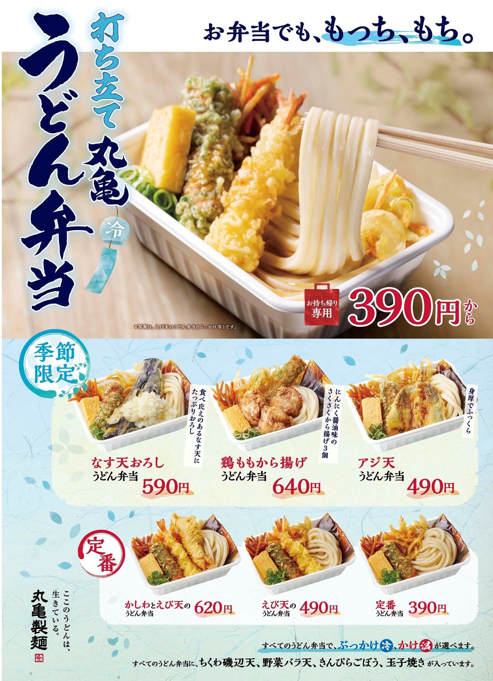 すべての「丸亀うどん弁当」で、ぶっかけうどん(冷)、かけうどん(温)が選べます。