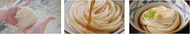 「おいしいうどん」は、徹底的に鮮度にこだわりぬいた「生きている」状態で提供されて初めて実現できる、と丸亀製麺は信じています。丸亀製麺がお届けするうどんは、国内 800 を超えるすべての店で一軒、一軒、手間を惜しまず、毎日、100%国産の小麦粉から打っています。打ち立てのうどんにこだわり、その場で切って、茹でて、作りたてをお客さまに提供しているからこそ、もちもちでおいしい独自の“丸亀食感”をお届けできています。