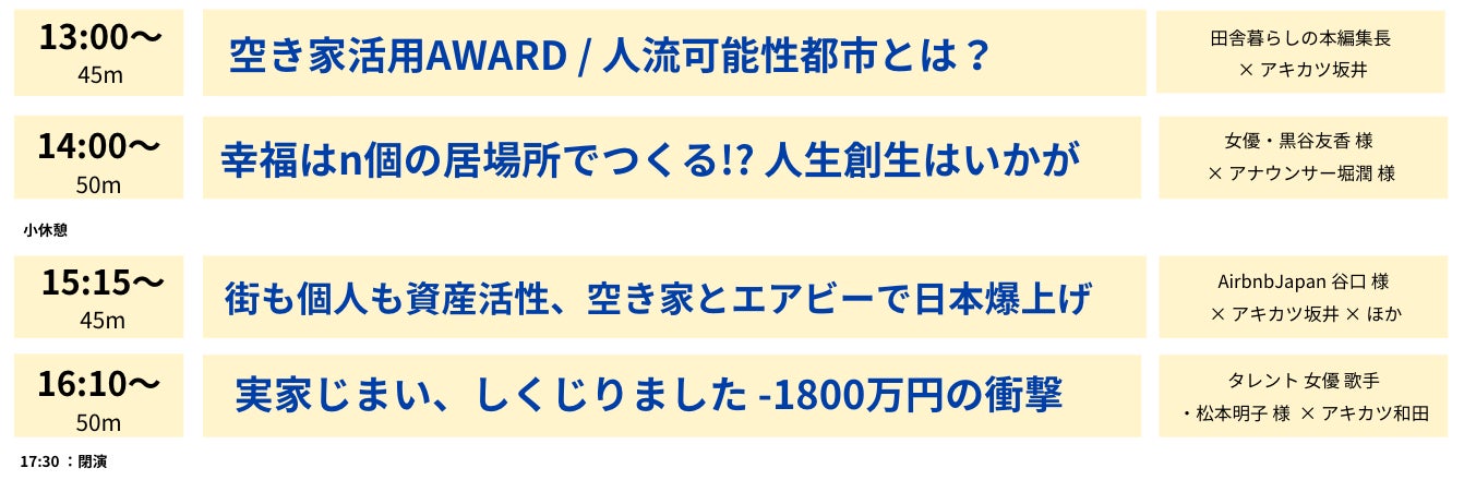 空き家に関しての法律が改正され、気になっている方も多いはず。空き家活用の失敗談や効果的な活用方法など、をトークショー形式で知ることができます。そして皆さんご存知、タレントの松本明子さんご自身の空き家体験を通して、皆さんの対応の参考にしてみてください。そのほか豪華ゲストも多数!