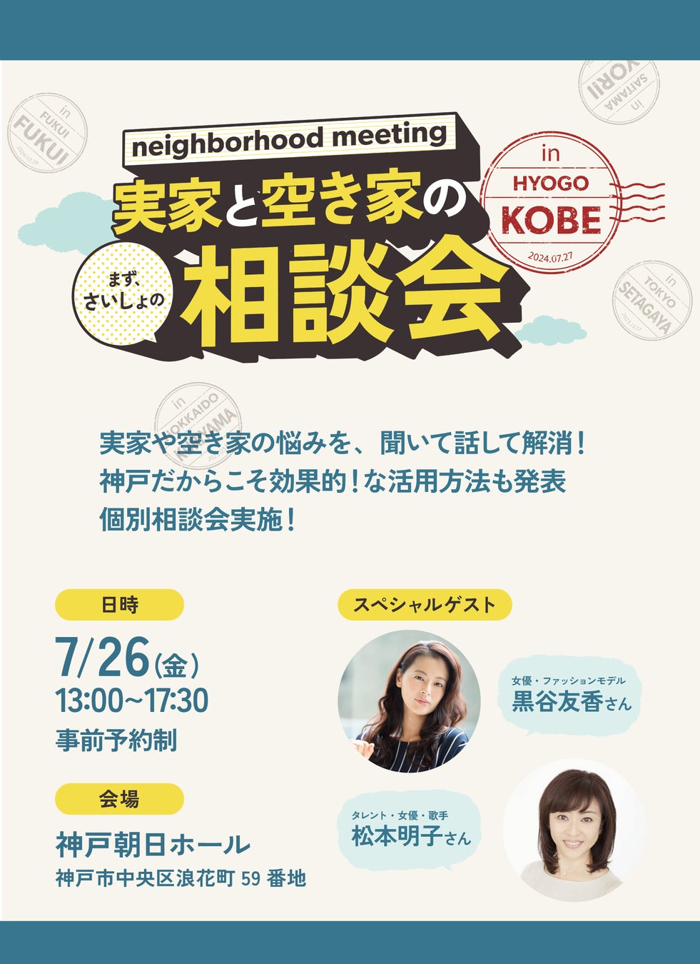 7⽉26⽇(金)13:00~@神戸朝日ホール、相談会とトークイベント。空き家相談を全国展開する空き家活用(株)主催。空き家相談、民泊転用、そして解体の仕方。まず相談ならこのイベント!奮ってご参加を。