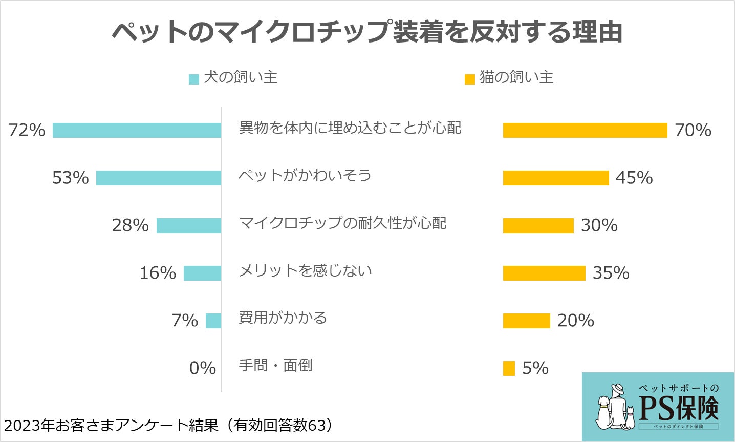 一方、マイクロチップ装着について「反対」「どちらかというと反対」と回答した犬と猫の飼い主(63名)に、その理由を聞きました。
