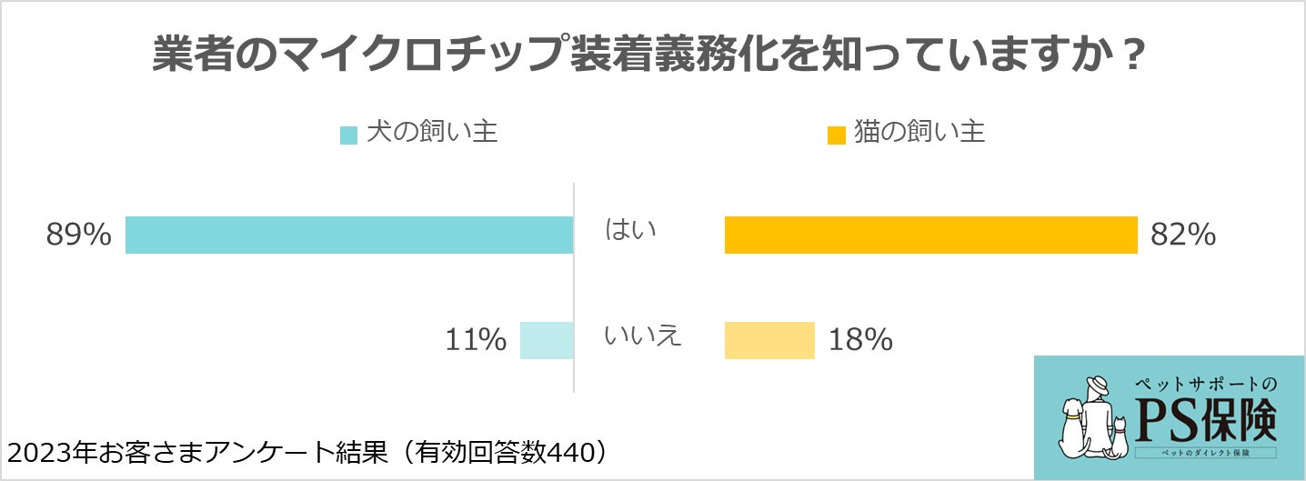 「はい」(業者のマイクロチップ装着義務化を知っている)と回答したのは、犬の飼い主で89%、猫の飼い主は、82%となり、昨年2022年5月行った同様の調査結果(犬78%、猫71%)から共に11ポイント上昇しました。