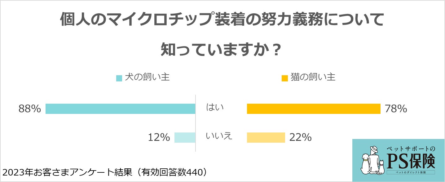 ペット保険の「PS保険」を提供する少額短期保険会社のペットメディカルサポート株式会社(本社:東京都港区赤坂、代表取締役社長:米満 明仁、以下『ペットメディカルサポート』)は、当社ペット保険「PS保険」のご契約者さま2,604名(有効回答数440名:犬の飼い主300名、猫の飼い主140名)を対象に、ペットの犬や猫のマイクロチップ装着について、飼い主の意識・実態調査を行いました。