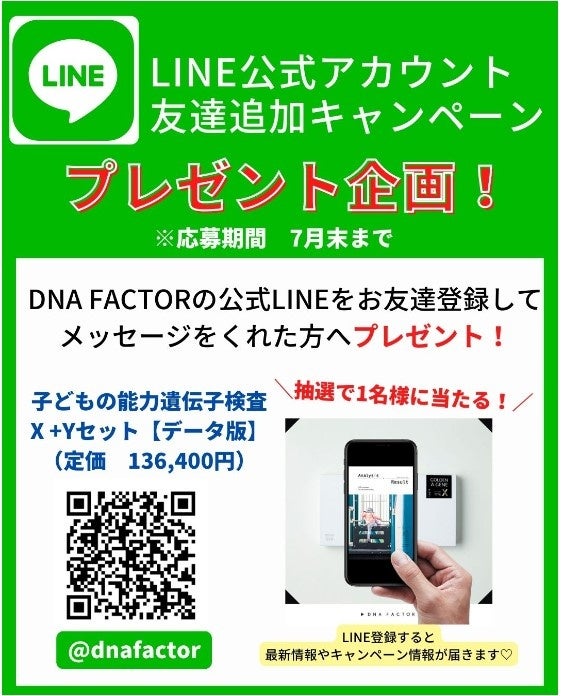 株式会社アルプロンのグループ会社、DTCフィールドで子ども向けの能力遺伝子検査数最大シェア数を誇る株式会社DNA FACTOR(福岡県福岡市:代表取締役 多根和宏)は、LINE公式アカウントの友達追加キャンペーンを開催致します。