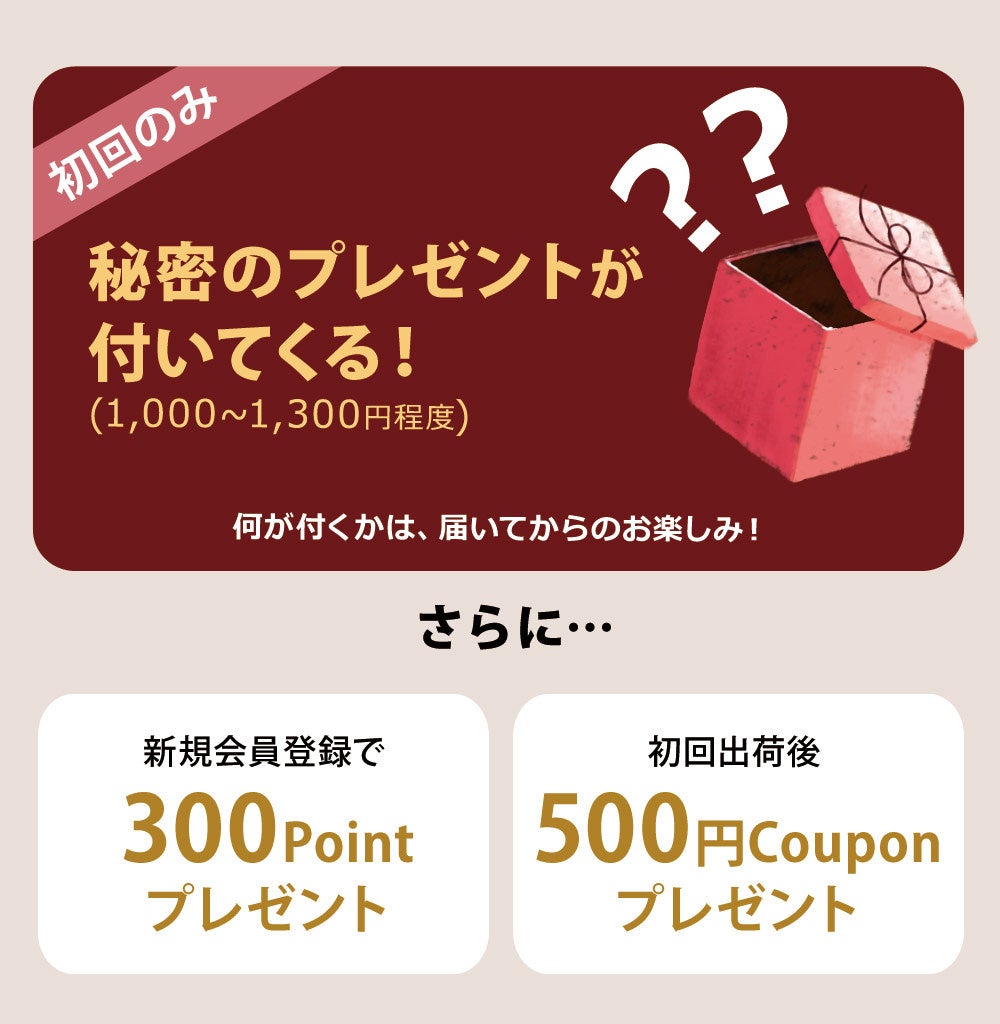 特典:1,000~1,300円相当のシークレットプレゼント300ポイント・500円分クーポンプレゼント