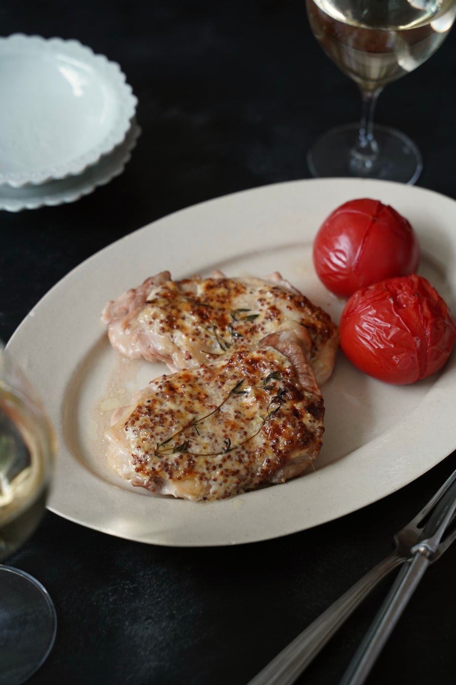 マヨネーズと粒マスタードで作ったソースが食欲をそそります。サイドで焼いたトマトも甘くて美味しいですよ。