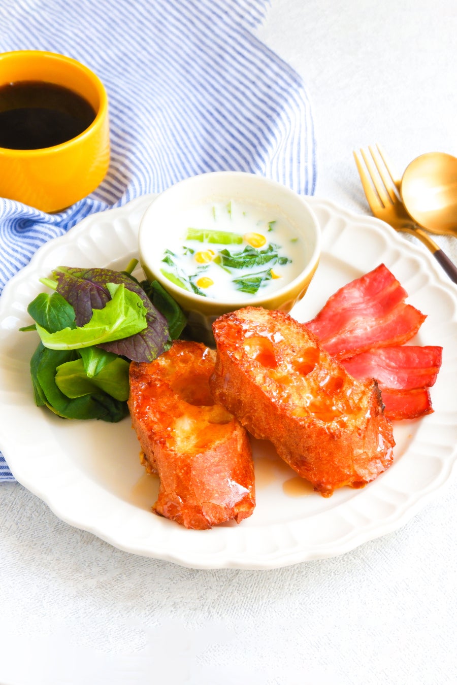 卵液はできれば一晩おき、中まで染み込ませましょう。この一手間で、レストランのフレンチトーストのように手の込んだ味わいに変身!ミルクスープの具材はほかにもミニトマト、ほうれん草、キャベツ、白菜、ブロッコリーなど火の通りやすい具材がおすすめです。