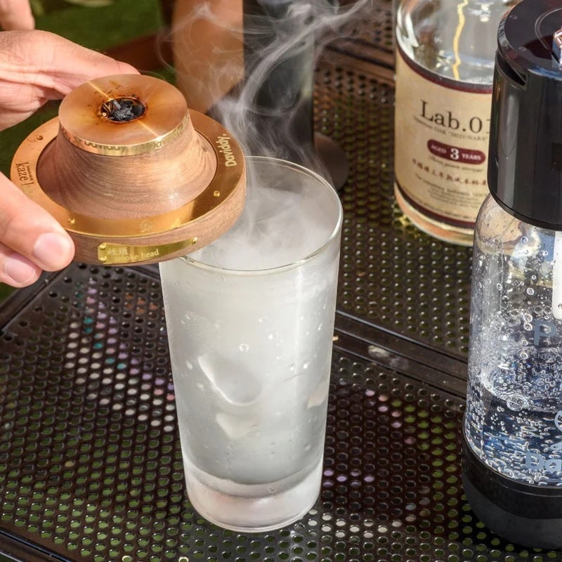 頂上にスモークチップをのせ、 5秒間バーナーで燻すと下から煙が降りてきます。