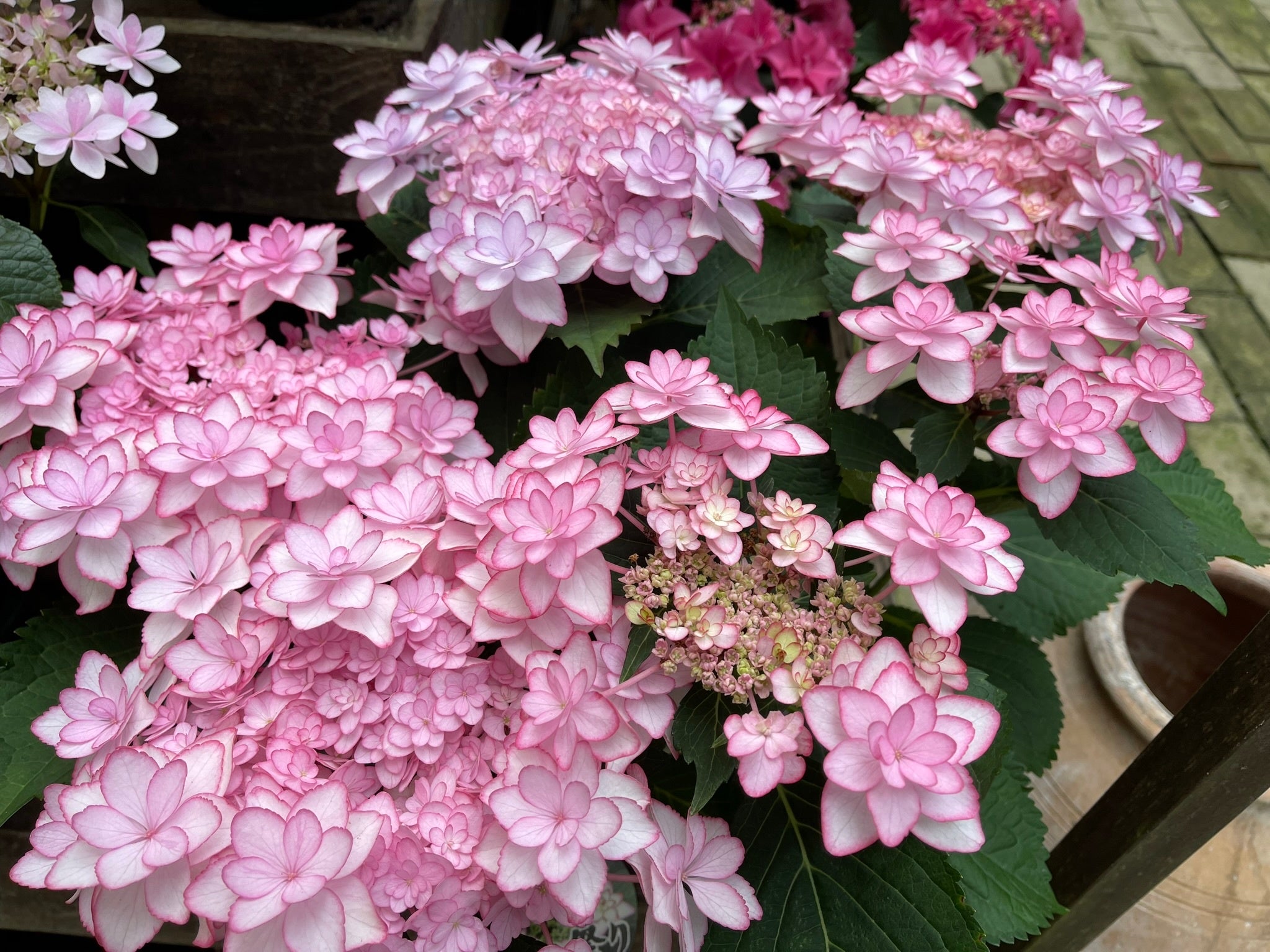 アジサイの⾊ごとの花⾔葉は、「⻘=⾟抱強い愛情」「ピンク=元気な⼥性」「⽩=寛容」。花⾔葉からも、⺟の⽇の贈り物には、ピンクのあじさいが好んで贈られているとのこと。でも、それぞれのお⺟さんのイメージから、⻘や⽩ももちろんありそうですね。