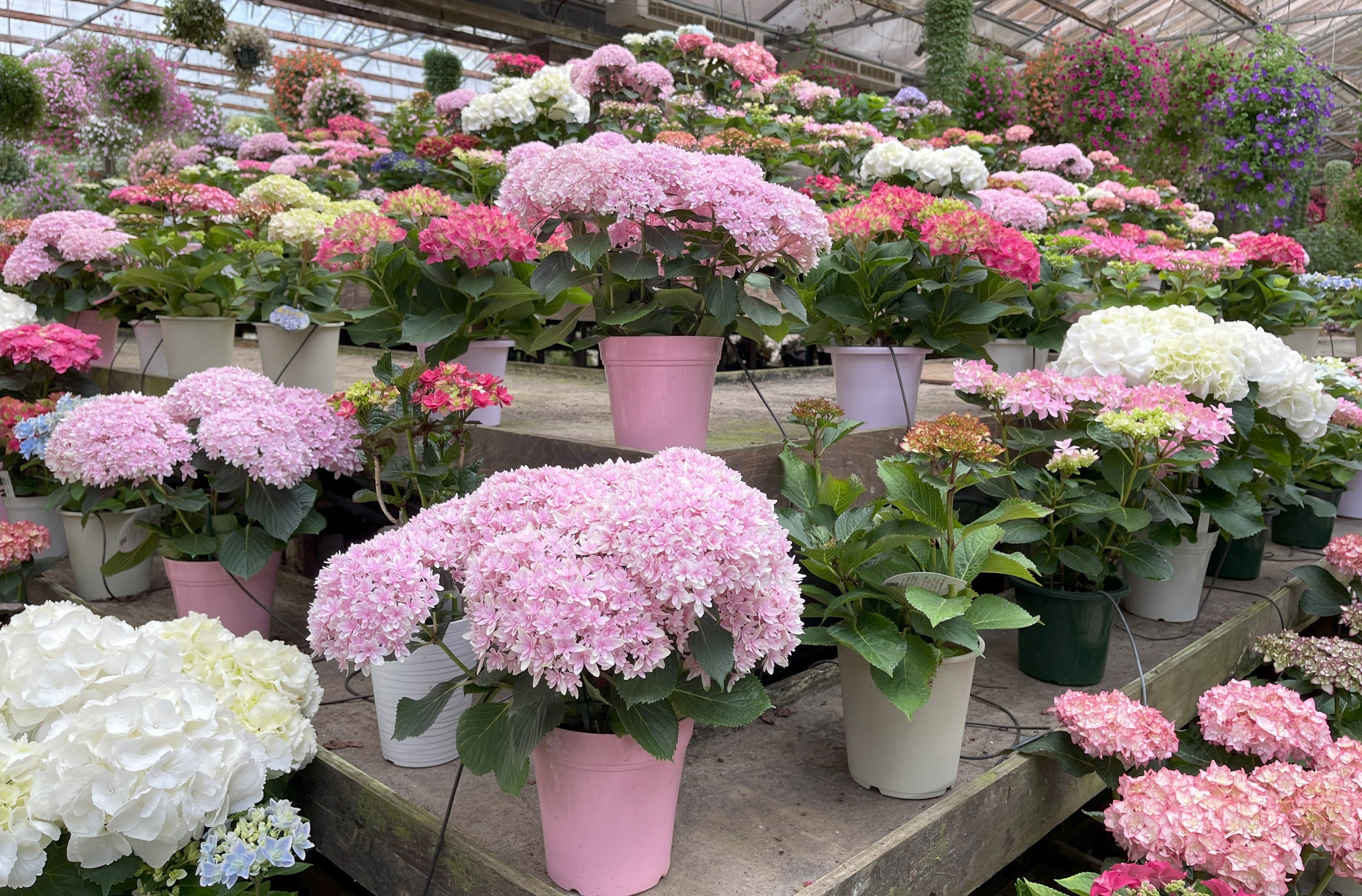 加茂荘オリジナルアジサイ「KAMOセレクション」を中⼼に、展示温室の真ん中に恒例のアジサイヒルズを展⽰しており、ヒルズから直接お好みのアジサイをえらんでご購⼊していただけます。