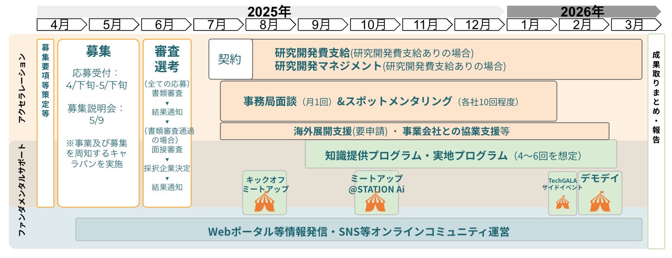 4 月下旬- 5 月下旬にアクセラレーション支援対象企業を募集し、7月-1月にメンタリングにより集中支援を行う。7 月、10 月、2 月にミートアップイベントを実施。