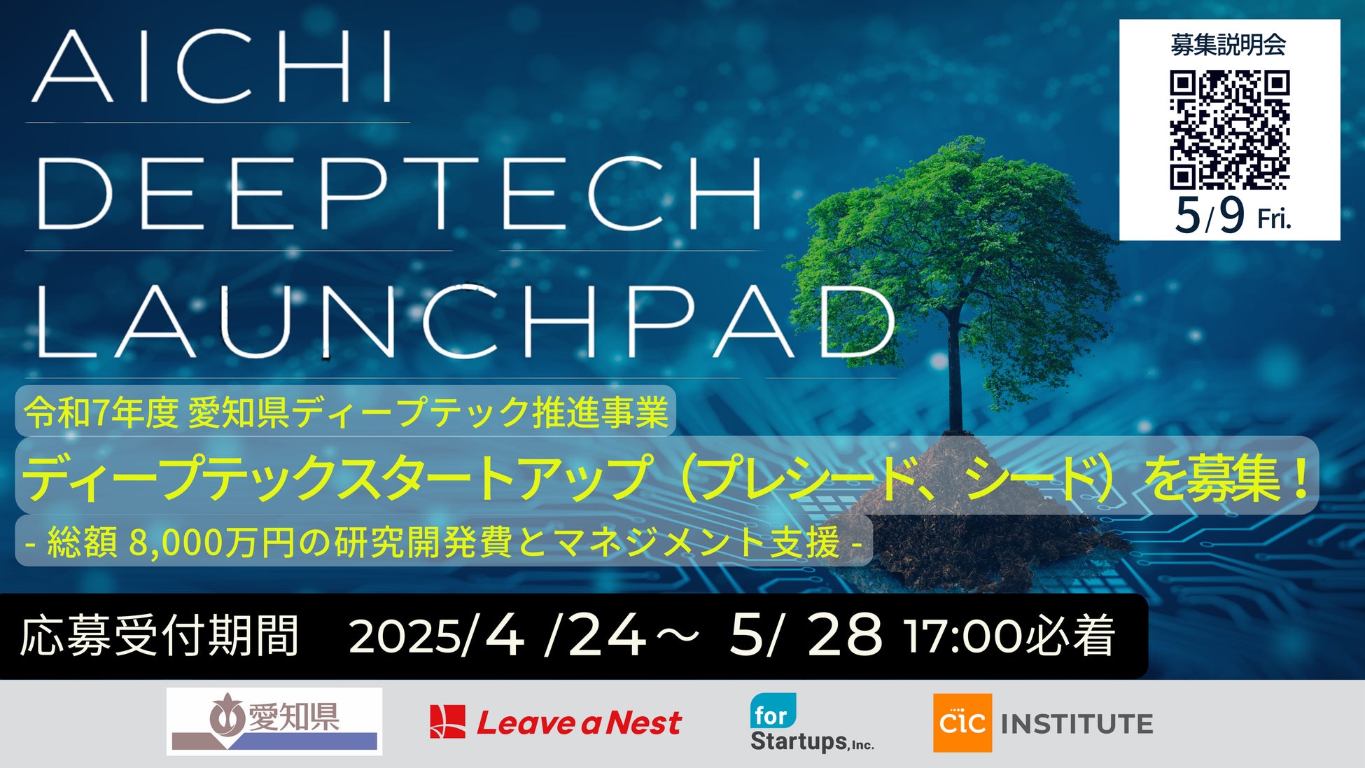 CIC Institute(本社:東京都港区虎ノ門、創業者兼CEO ティム・ロウ)は、株式会社リバネス(本社:東京都新宿区、代表:丸幸弘)およびフォースタートアップス株式会社(本社:東京都港区六本木、代表:志水雄一郎)と共同で運営する、愛知県ディープテック推進事業「 Aichi Deeptech Launchpad 」2025 年度への参加希望スタートアップの募集を開始いたします。