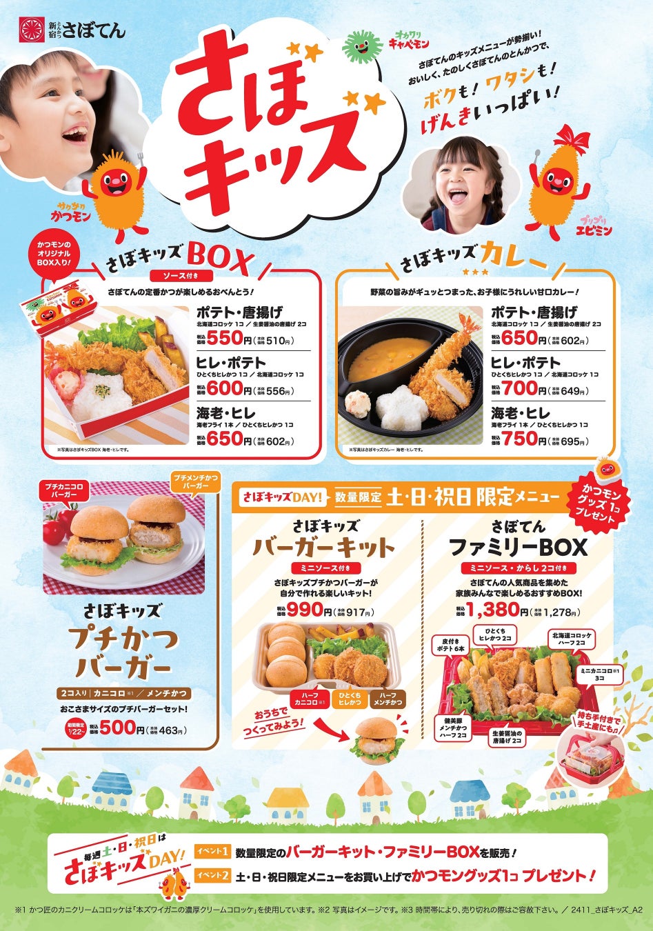 さぼてんの公式キャラクター「サクサクかつモン」デザインの「さぼキッズBOX」のほか、お子さまから大人の方まで楽しんでいただけるさぼてん王道商品を使用したメニューを取り揃えています。「さぼキッズバーガーキット」「さぼてんファミリーBOX」は、土日祝日のみ数量限定で販売し、土日祝日限定メニューをお買い上げいただいたお客様には、「かつモングッズ」をプレゼントいたします。