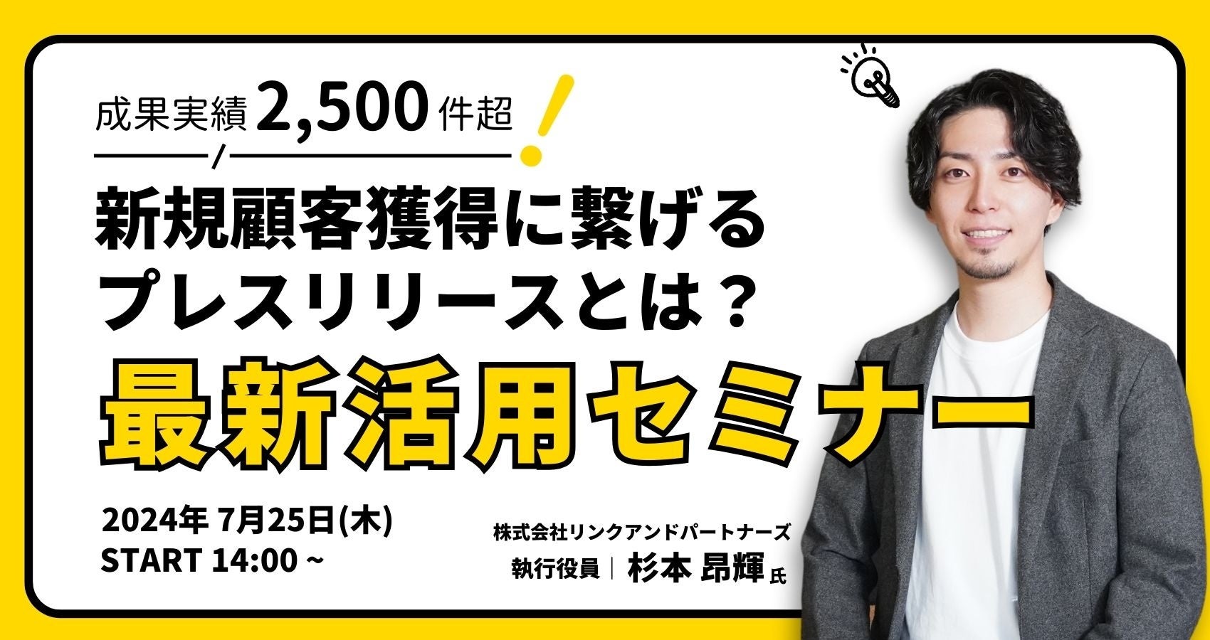 企業のPR支援プロダクト「PRIZMA」ブランドを展開する株式会社リンクアンドパートナーズは、2024年7月25日(木)14:00-15:00に『【2500件超の案件実績あり】新規顧客の獲得ができる「プレスリリース」とは?注目を集める手法を公開!』と題するオンラインセミナーを開催いたします。