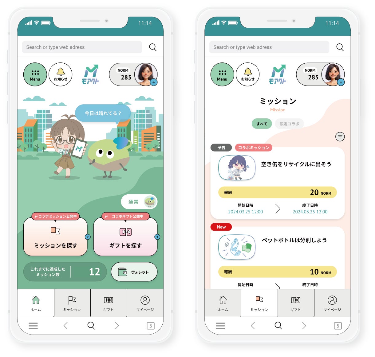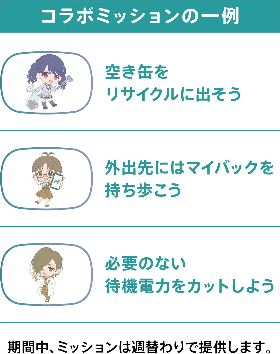 アプリ内で「モアクトアンバサダーズ」達から週替わりで出題される、「空き缶をリサイクルに出そう!」「ペットボトルは分別しよう!」「使わない電気は消そう!」などの様々なコラボミッションに挑戦することが可能(参加人数:2,500人)