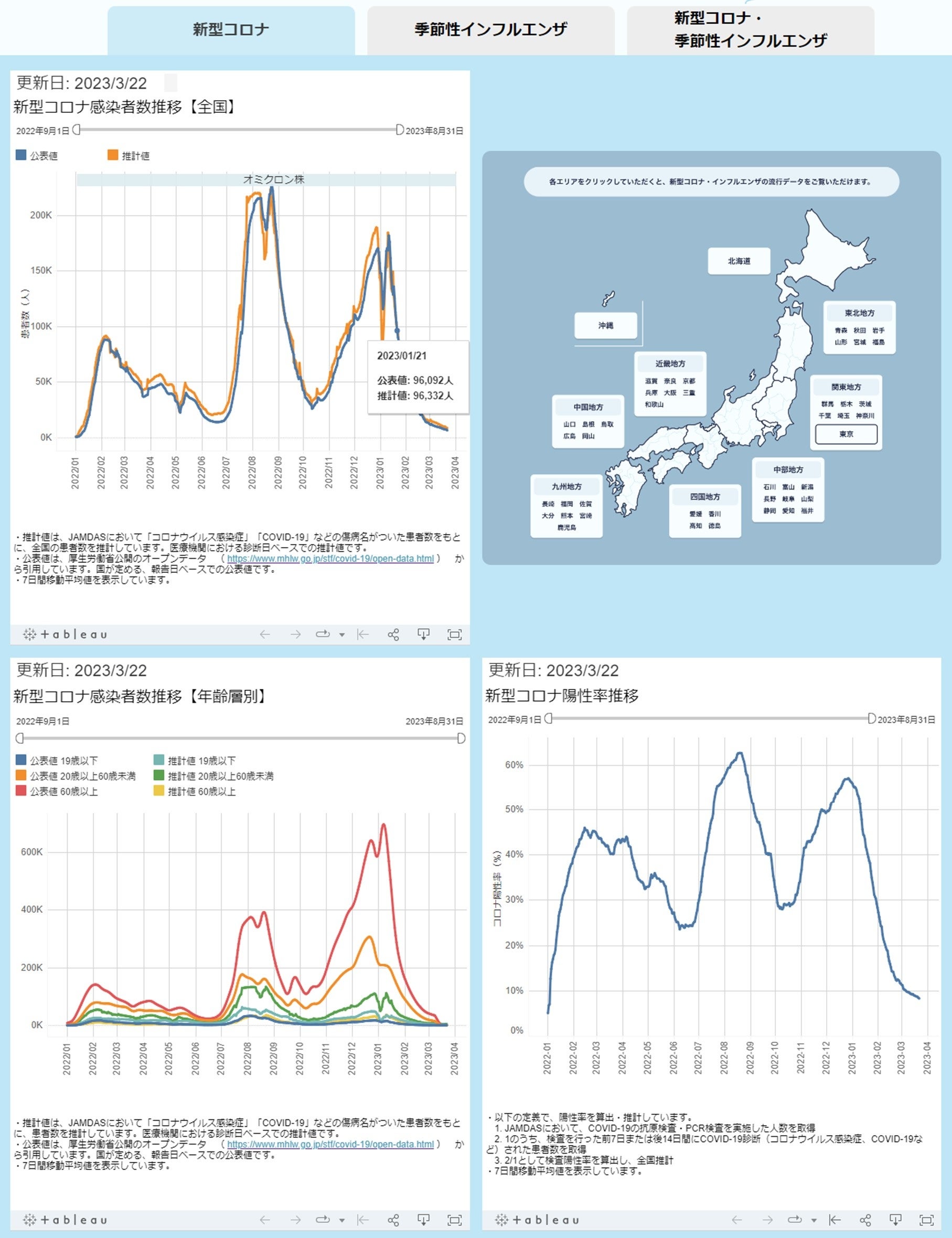 感染症の予防には、国民の皆さま一人ひとりが予防接種を受けるだけにとどまらず、最新の流行状況を正しく把握した上で、適切に行動していくことが重要だとモデルナは考えており、この度、新型コロナウイルス感染症とインフルエンザの流行状況(推計)の日次データを地域別、年齢別で公開することとしました。モデルナが公開するリアルタイムの情報が、個人だけではなく、自治体、医療従事者、学校関係者、高齢者施設関係者、イベント関係者、など多くの方々の意思決定の一助になることを期待しています。なお、公開データはJAMDAS*(Japan Medial Data Survey:日本臨床実態調査)のリアルワールドデータに基づいています。