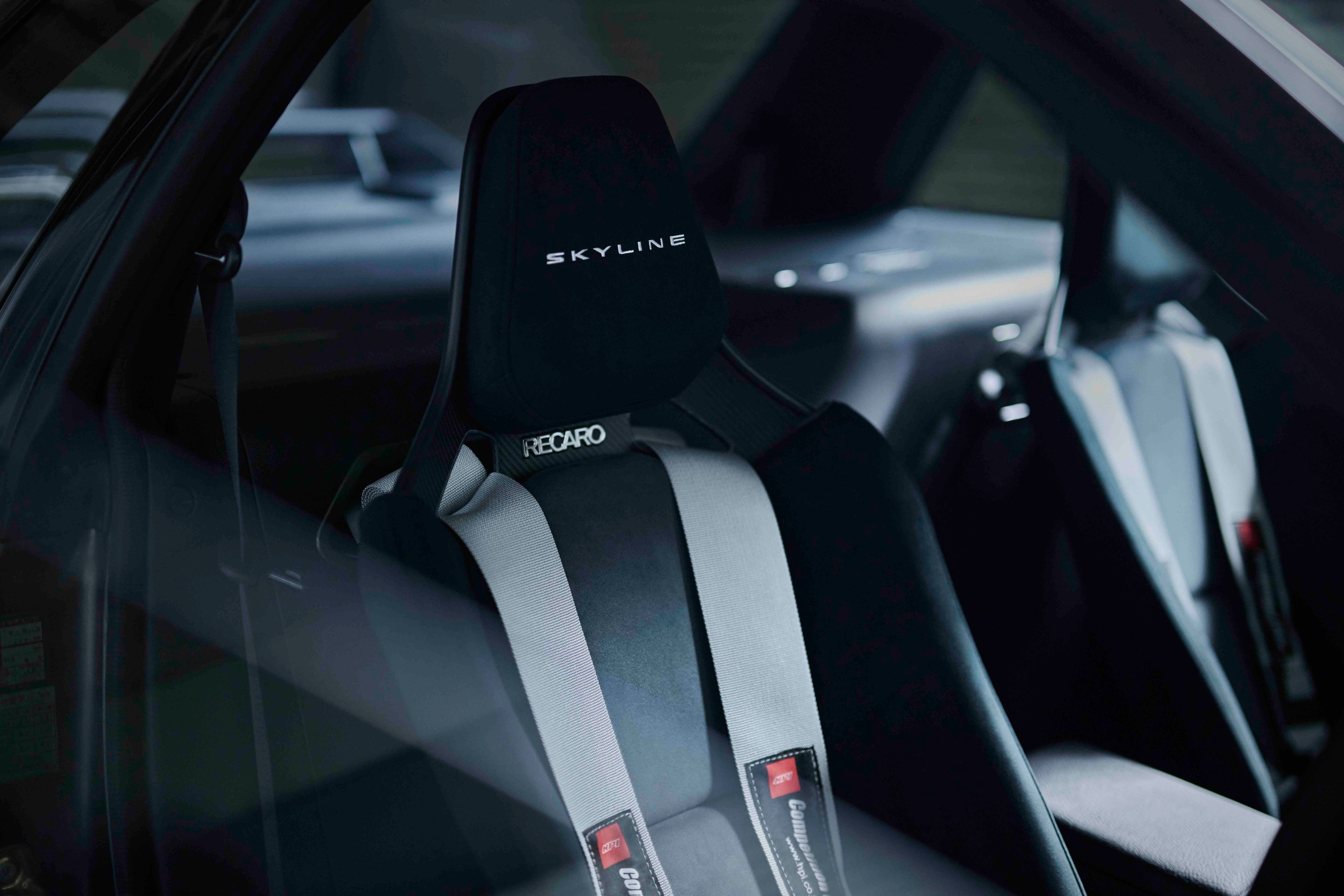 インテリアにおいてはステアリングやシフトノブはオリジナルを再現しながら、メーターとセンターコンソールに液晶パネルを採用しています。画面上の計器類やコントロールパネルでR32GT-Rのオリジナル表示を色褪せない形で忠実に再現しています。特注のレカロシートや後席に搭載されたバッテリーにはSKYLINEのロゴをあしらっています。