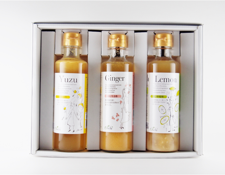 徳島県産柚子果汁、広島県産レモン果汁100%を使用し、国産純りんご酢をベースに、蜂蜜などを使用した、のむ柚子酢、のむ檸檬酢。そして、高知県産すり生姜をぜいたくに使い、国産純りんご酢、蜂蜜などを使用して造った風味豊かな飲みやすい生姜酢です。全て広島北部から湧き出る良質な天然水を使用して造られたまろやかな飲む酢です。水・炭酸・牛乳など3倍に割ってお飲みください。