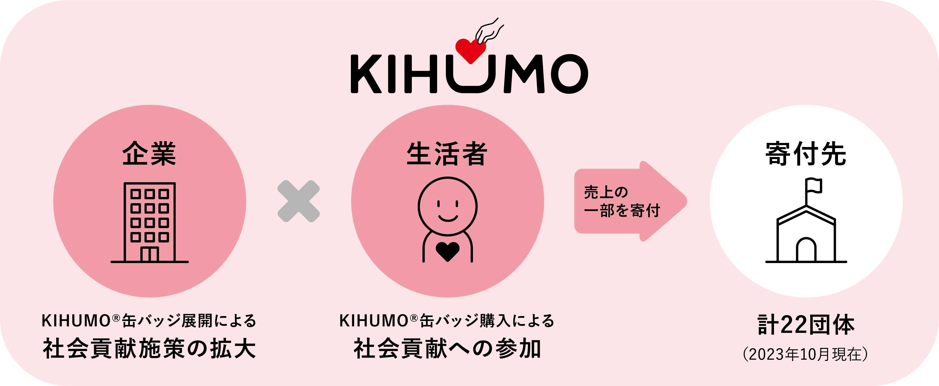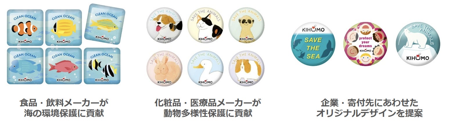 「KIHUMO®」は、寄付先の選定サポートから、貢献したい社会課題や企業ブランド・キャラクターにあわせたオリジナルデザインの缶バッジ製作・生産、販売先の開拓により、寄付先とのつながりや製品の販売網をお持ちでない企業でも生活者とともに社会貢献活動を実施いただけます。これまで社会課題の解決や貢献に関心を持ちながらも具体的な行動に結びついていなかった生活者にとっては、KIHUMO®缶バッジへの興味関心が入口となり、購入を通じ身近に社会貢献に参加する機会を提供します。