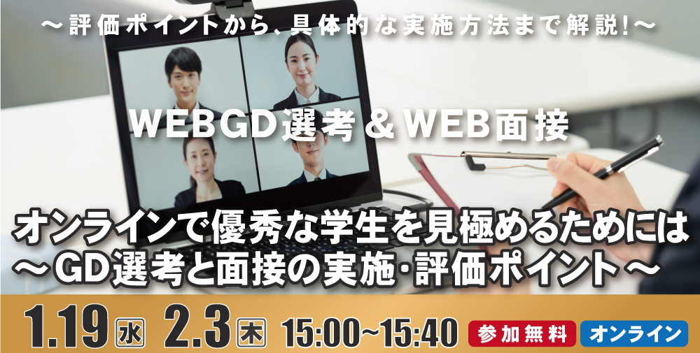≪1/19(水)・2/3(木)開催≫ 300社の採用コンテンツ制作会社のWEBセミナー“オンラインで優秀な学生を見極めるためには ~GD選考と面接の実施・評価ポイント~”