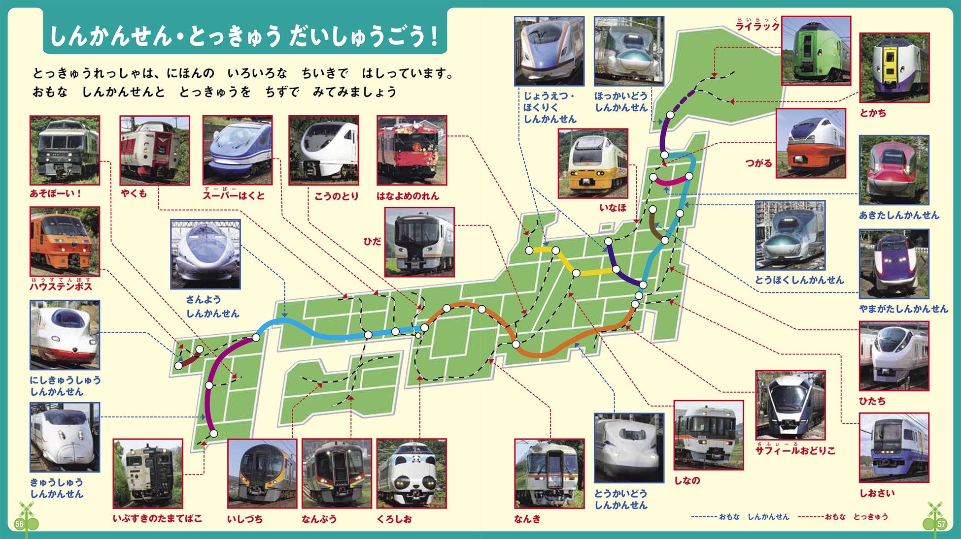 ▼日本全国を走るたくさんの電車が見開きで一度に見られる!