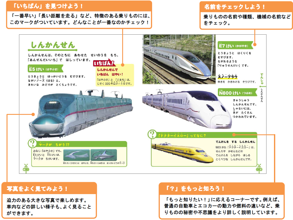 身近な乗りものはもちろん、普段は見られない複雑なつくりの乗りものに、子どもたちは興味津々です。本書は、多種多様な乗りものが掲載されているだけでなく、子どもたちの好奇心を満たし、学ぶ心を育むしかけが満載です。