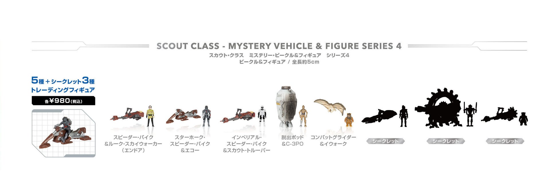 『スター・ウォーズ』に登場する小型のビークルを、全長約5cmで立体化。全高約2.5cmのアクションフィギュアがセットで付属し、ビークルに乗せて遊ぶことができる。基本のラインナップ5種に加えて、シークレット3種が存在。パッケージは中に何が入っているか分からないワクワク感が楽しめるブラインドボックスとなっている。