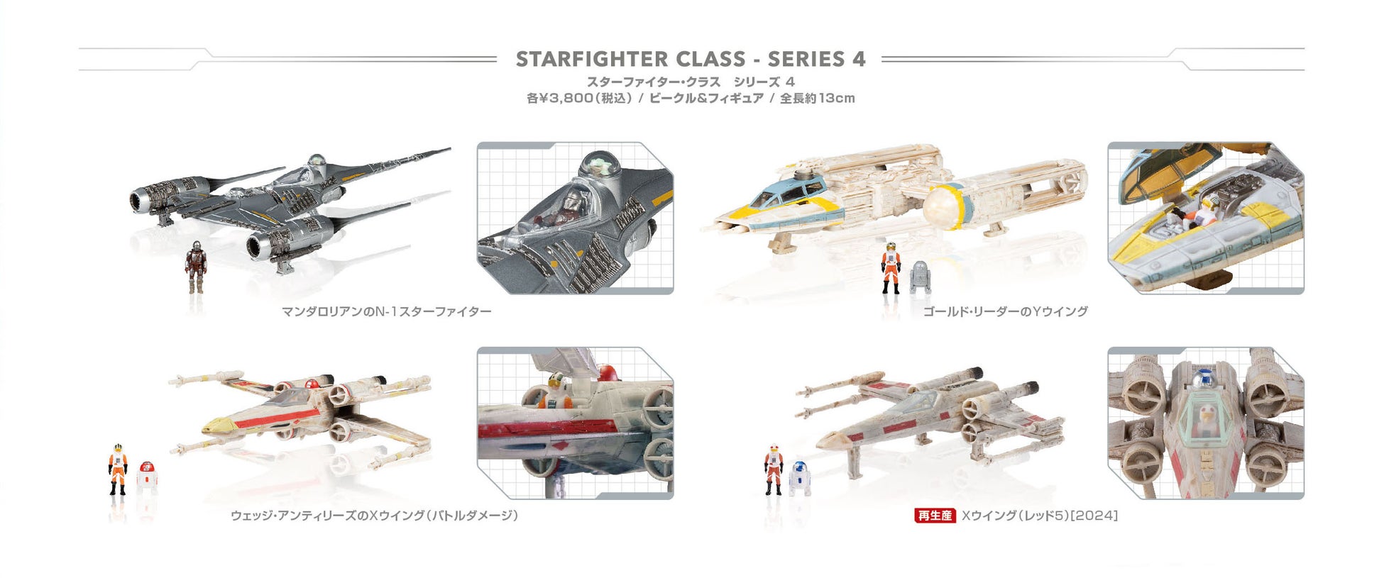『スター・ウォーズ』に登場する大型のビークルを、全長約13cmで立体化。コクピットは開閉ができ、全高約2.5cm、手足が可動する付属のアクションフィギュアを乗せて遊ぶことができる。ラインナップは、マンダロリアンのN-1スターファイター、ゴールド・リーダーのYウイング、ウェッジ・アンティリーズのXウイング(バトルダメージ)、Xウイング(レッド5)[2024]※の4種。パッケージは、そのまま飾ってもカッコいいブリスターパック仕様となっている。