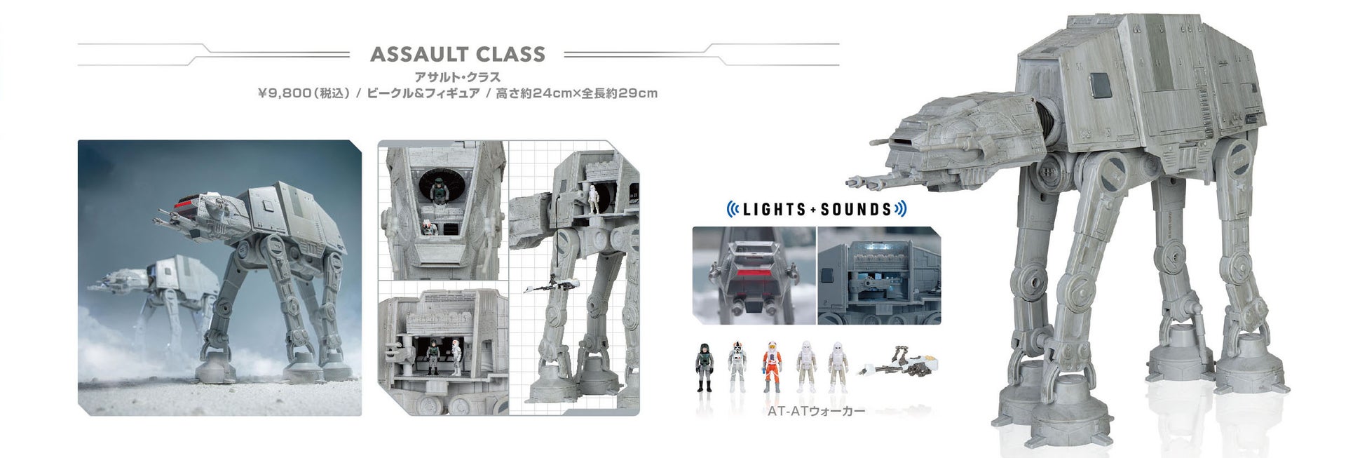 『スター・ウォーズ』に登場するAT-ATウォーカーを、高さ約24cm×全長約29cmで立体化。全高約2.5cm、手足が可動する、ルーク・スカイウォーカー(ホス)、ヴィアーズ将軍、AT-ATパイロット、2体のスノートルーパーのアクションフィギュアが付属。また、フィギュアを乗せられるスピーダー・バイクが付属する。機体のヘッドと4つの脚は可動。脚は関節まで可動するので、さまざまな動きをつけることができる。ヘッドにあるコクピットには、3体のフィギュアを乗せることが可能だ。また、機体の側面は取り外しができ、フィギュアを乗せて船内で遊ぶことができる。スピーダーを格納するスペースや、搭乗用のケーブルが備わっているのも嬉しいポイント。ケーブルは歯車を回すことで下ろしたり引き上げたりできる。機体下部に内蔵するロープを使えば、劇中でルークが奇襲するシーンを再現可能だ!さらにライトアップ機能とサウンドギミックを搭載。機体上部と側部にあるボタンを押すことで、ヘッドや機体内部をライトアップさせたり、劇中の効果音や台詞を発動できる。パッケージは、そのまま飾ってもカッコいいウィンドウボックス仕様。