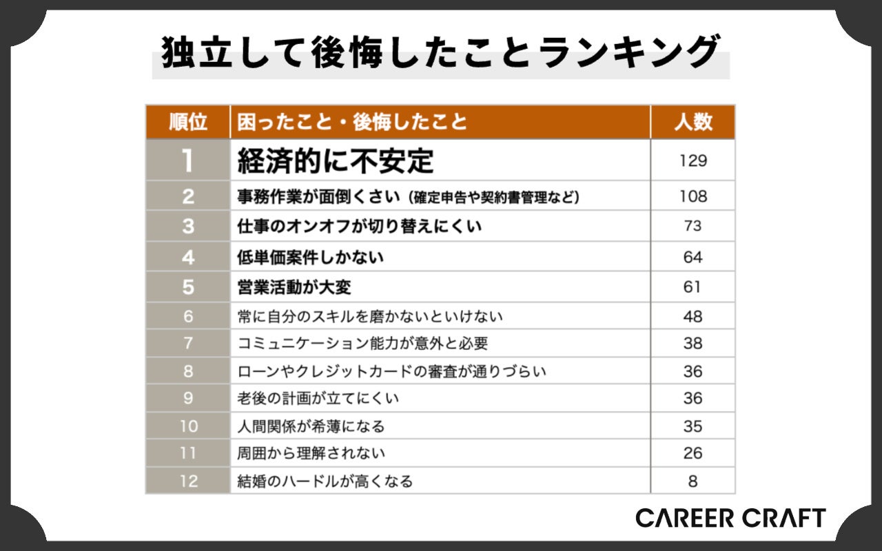 フリーランスになろうか悩んでいる人が最も気になる「独立して後悔したことランキング」。