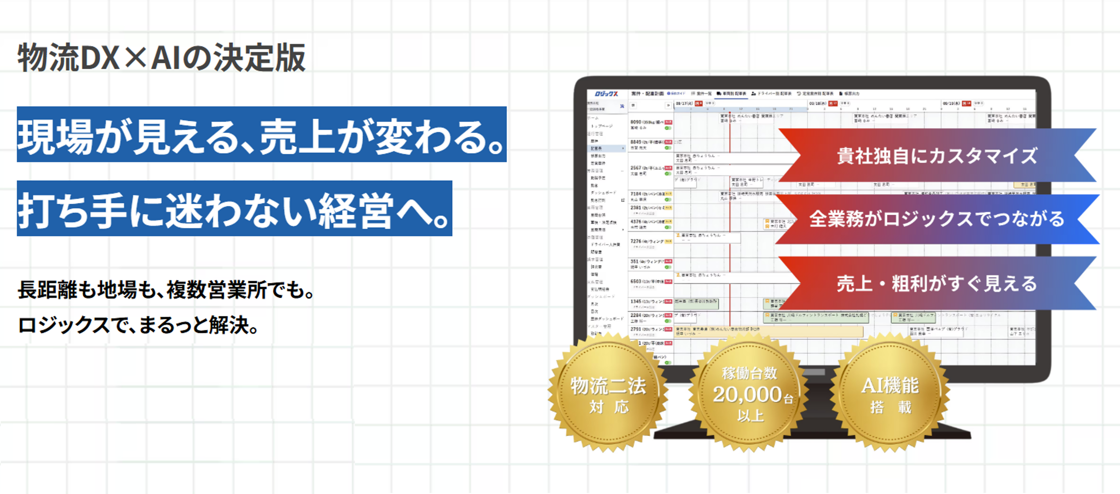 運送事業者に特化したクラウド型の業務管理ツールであり、煩雑な運送事業者の管理業務を、案件の受注から配車・請求書の発行まで一気通貫でデジタル化します。ロジックスを用いて業務を行うと、経営数値(原価・利益率・車両回転率等の収支改善につながる各種指標)が自然と一元管理されるため、収支改善・運賃交渉に必要な数字を、特別な手間をかけることなく可視化することが可能です。ロジックスは、運送事業者の業務効率化と経営DXを同時に実現いたします。