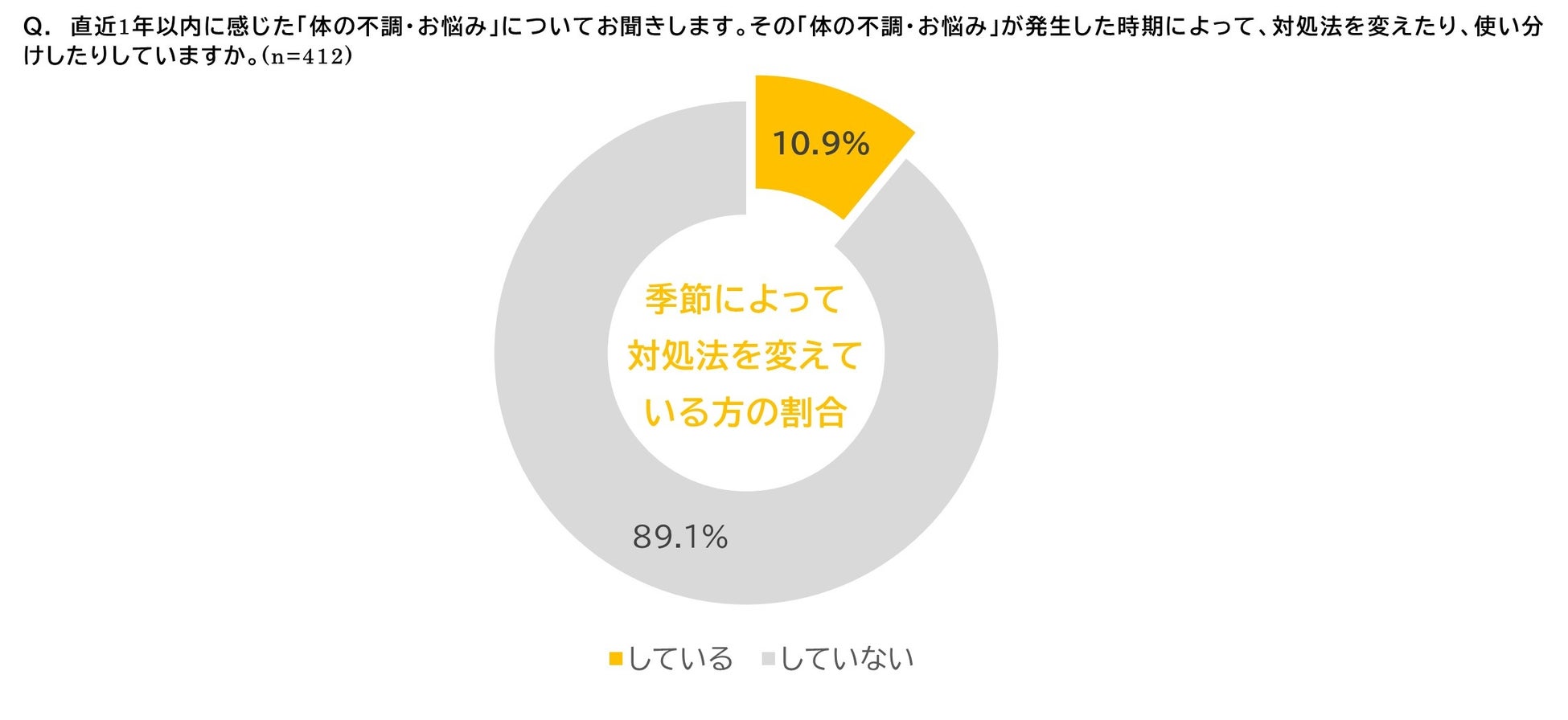 また直近1年以内に感じた「体/心の不調・お悩み」が発生した時期によって、対処法を変えているか尋ねたところ、対処法を変えていると回答した方は各症状において平均約1割程度と低く、発生時期によって対処法を変えている人は非常に少ないということが分かりました