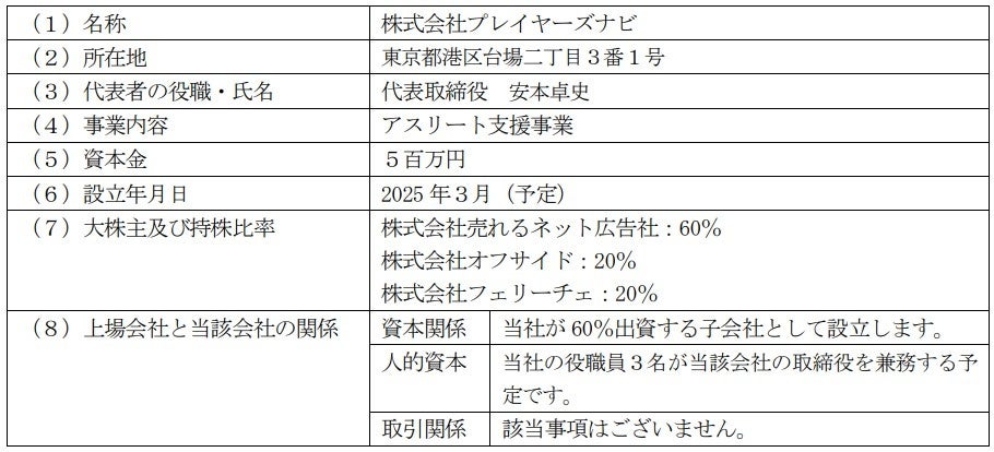 株式会社売れるネット広告社(本社:福岡県福岡市、代表取締役社長CEO:加藤公一レオ、東証グロース市場:証券コード9235、以下 売れるネット広告社)は、2024年12月25開催の取締役会において、現役アスリートの企業への雇用促進・セカンドキャリア支援を行う新会社「株式会社プレイヤーズナビ(本社:東京都港区、代表取締役社長CEO:安本卓史、以下 プレイヤーズナビ)」を設立し、当該子会社にて新規事業を開始することについて決議いたしましたので以下のとおりお知らせいたします。なお、本件については、株式会社東京証券取引所が定める「子会社等の異動を伴う株式又は持分の譲渡又は取得その他の子会社等の異動を伴う事項」、「新たな事業の開始」にかかる適時開示軽微基準の範囲内であり、任意で開示するものであることから、一部事項について記載を省略しております。