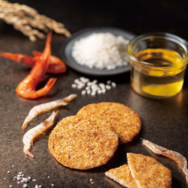 1.生地(富山米100%・白海老)自社独自配合 一度焼き工程を入れ、香りと食感を引き立てる