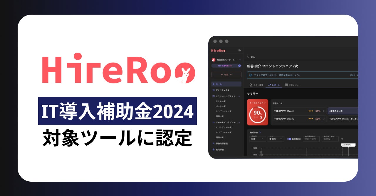 株式会社ハイヤールー(本社:東京都渋谷区、代表取締役:葛岡宏祐)が提供するコーディング試験サービス『HireRoo(ハイヤールー)』( https://hireroo.io )は、この度「サービス等生産性向上IT導入支援事業費補助金(以下、「IT導入補助金2024」)」の対象ツールとして認定され、補助対象となる中小企業が『HireRoo』導入時に、5万円以上、150万円未満の補助金申請を行うことが可能となりました。
