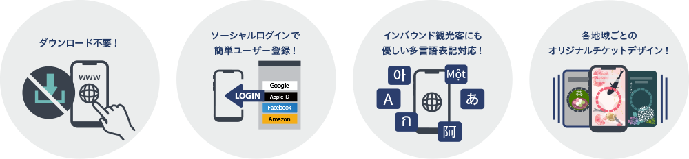 「QUICK TRIP Ticket」は、各事業者・エリア専用かつダウンロード不要のWEBアプリを提供し、乗車券や施設入場券をはじめとしたチケットをデジタル化して発行・販売・管理するシステムです。ソーシャルログイン(Google、Facebook、Apple、Amazon)に対応するとともに、7言語(日本語・英語・中国語(簡体・繁体)・韓国語・ベトナム語・タイ語・インドネシア語)での表示に対応しており、アプリごとに使用する言語を選ぶことができます。