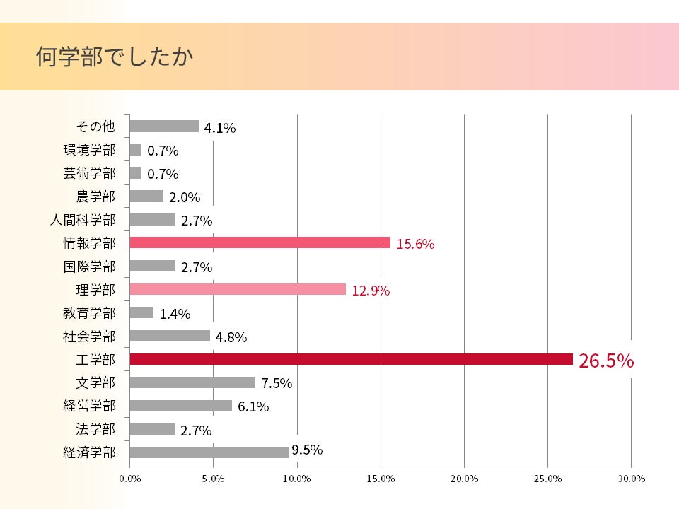 ITエンジニアになる前に大学生だった方に学部をたずねたところ、最も多かったのは工学部で26.5%、続いて情報学部の15.6%、理学部の12.9%と、上位3学部は理系学部でしたが、4位以降は経済学部(9.5%)や文学部(7.5%)など文系の学部が続きました。