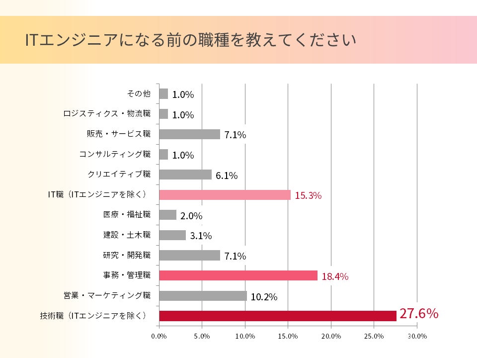 会社員からの転職の方に元の職種をたずねると、技術職(ITエンジニアを除く)が27.6%で最も多く、次に事務・管理職の18.4%が続きました。