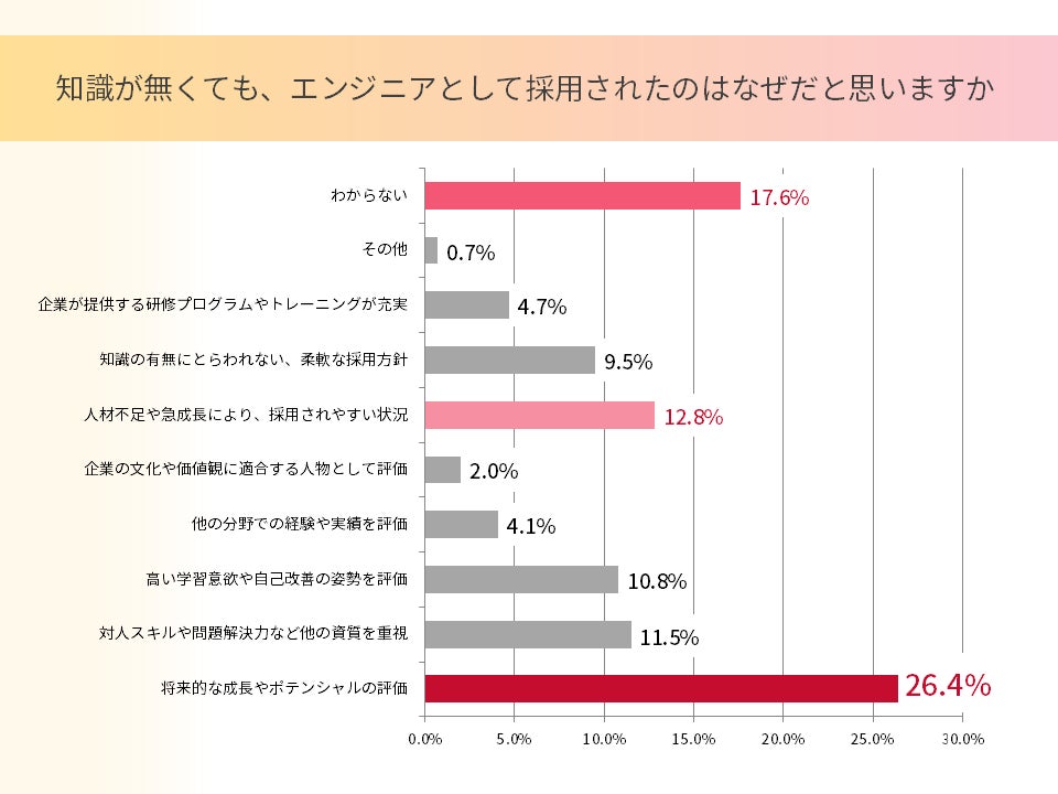 エンジニアとして働く前に、ITの知識がなかったと答えた方に、採用された理由はなんだと思うかたずねたところ、「知識がなくても、将来的な成長やポテンシャルが評価されたから。」と考えている人が最も多く、26.4%であることがわかりました。