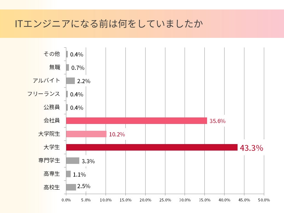 ITエンジニアになる前に何をしていたかたずねたところ、大学生が最も多く43.3%、続いて会社員が35.6%でした。